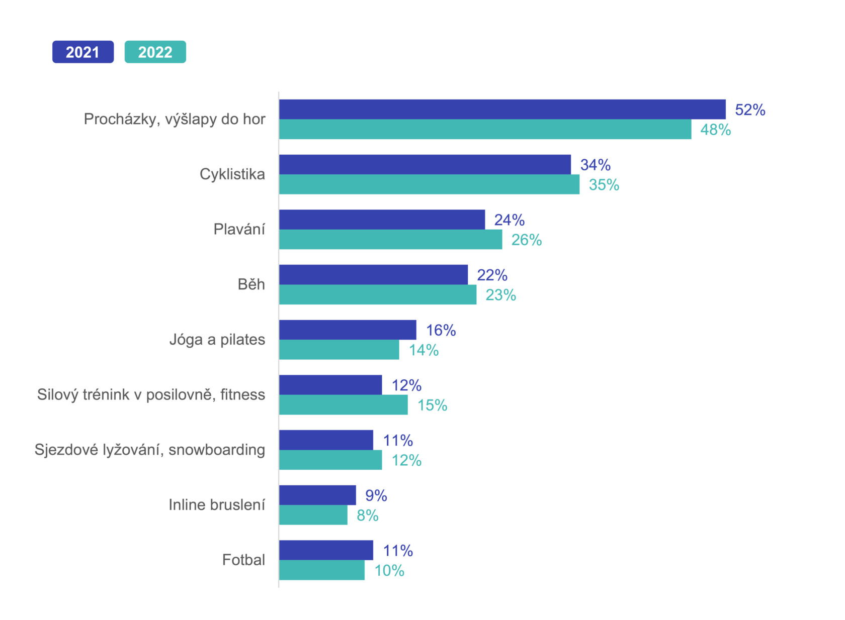 S odchodem pandemie ubyl také zájem o procházky či výšlapy do hor. Oproti roku 2021, kdy do přírody na vycházky vyráželo 52 % Čechů, se turistice věnuje pouze 48 % dotázaných. Podobně klesla také obliba jógy a pilates, které cvičí pouze 14 % dotázaných. Jak ukazuje průzkum MultiSport Index, narostla oproti tomu popularita plavání a fitness center. Plavecké bazény pravidelně navštěvuje 26 % Čechů a na silový trénink do posiloven zamíří celkem 15 % z nich. Jedná se zároveň o dvě nejčastější sportovní zařízení, kterým se zdražování nevyhne.