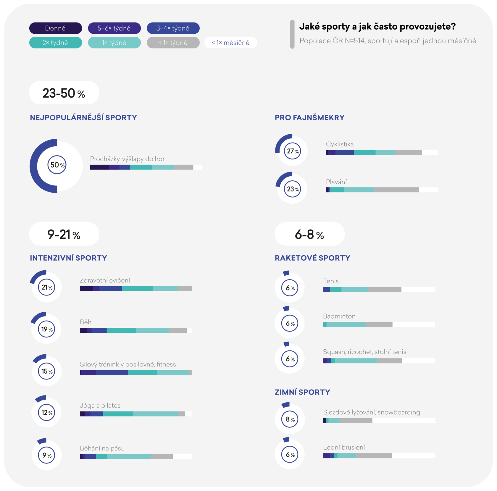 V porovnání s minulým měřením klesla také frekvence sportování. Zatímco v roce 2022 sportovalo v průměru alespoň jednou měsíčně 87 % Čechů, v uplynulém roce si čas na sport jednou za měsíc našlo pouze 6 z 10. Sportovci si udrželi frekvenci na podobné úrovni, polovina z nich se sportu věnuje alespoň třikrát týdně. Negativní trend je však patrný zejména u těch, kteří se nepovažují za sportovce. U nich frekvence výrazně poklesla a značná část se přesunula do kategorie těch, kteří nesportují vůbec.