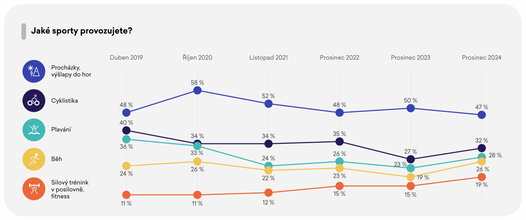 Žebříčku nejpopulárnějších sportovních aktivit v Česku stále dominuje turistika a cyklistika. Vyplývá to z průzkumu MultiSport Index. Stoupá také popularita plavání, běhu i silových tréninků a návštěv fitness center. Oblíbenost těchto “levnějších” sportů potvrzuje, že Čechy stále trápí finanční náročnost aktivního stylu života. Jako hlavní překážku na cestě ke zdravému životnímu stylu označila v průzkumu právě finance třetina Čechů.