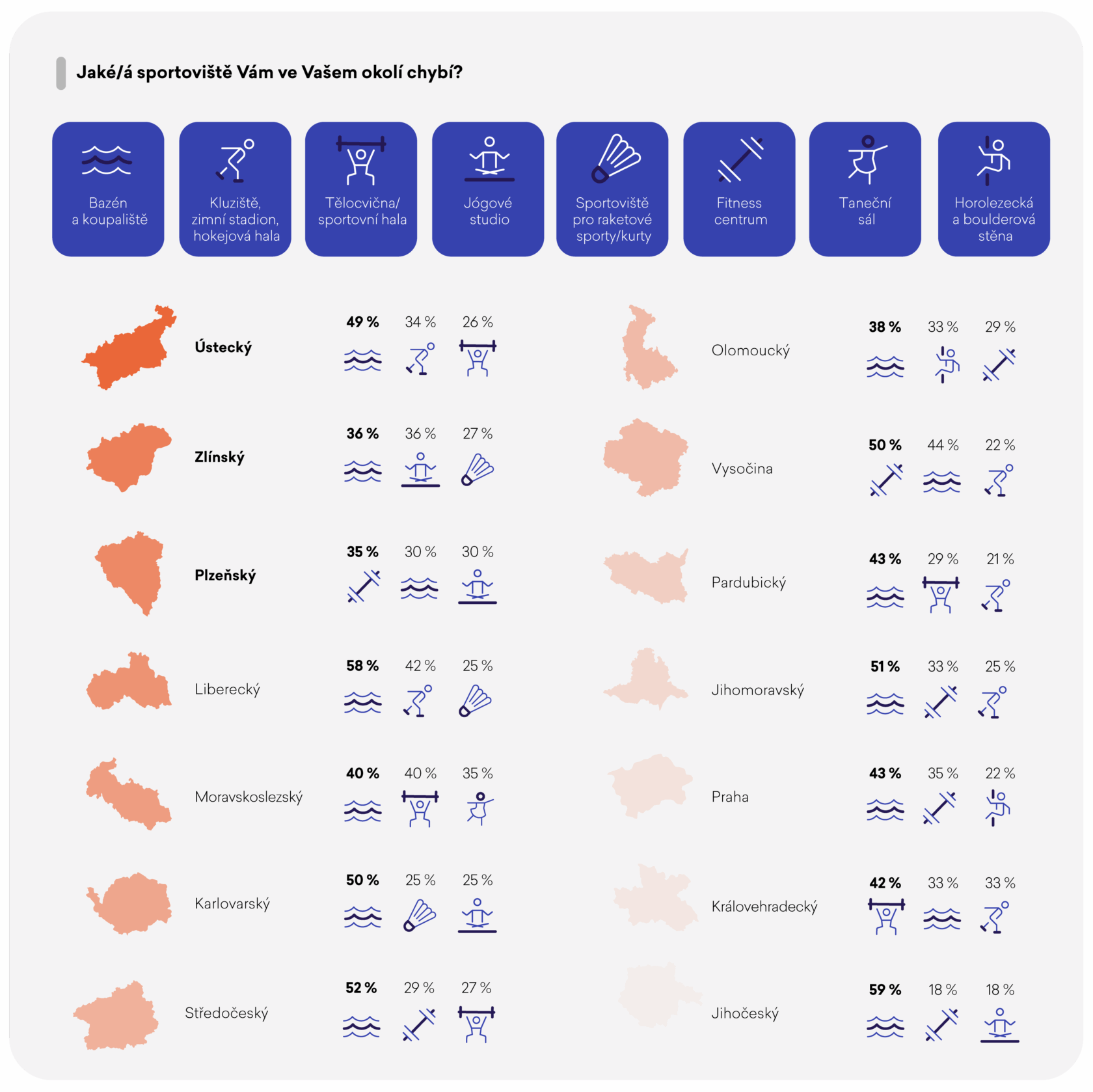 Požadavky na sportoviště se napříč republikou různí. Zatímco například v Jihočeském a Libereckém kraji místním nejvíce chybí bazény a koupaliště, uvedlo tak téměř 60 % dotazovaných, obyvatele Královehradeckého a Moravskoslezského kraje nejvíce pálí nedostatek tělocvičen a sportovních hal. Polovina obyvatel Vysočiny pociťuje nedostatečně širokou nabídku fitness center, ve Zlínském kraji je zase největší poptávka po jógových studiích.