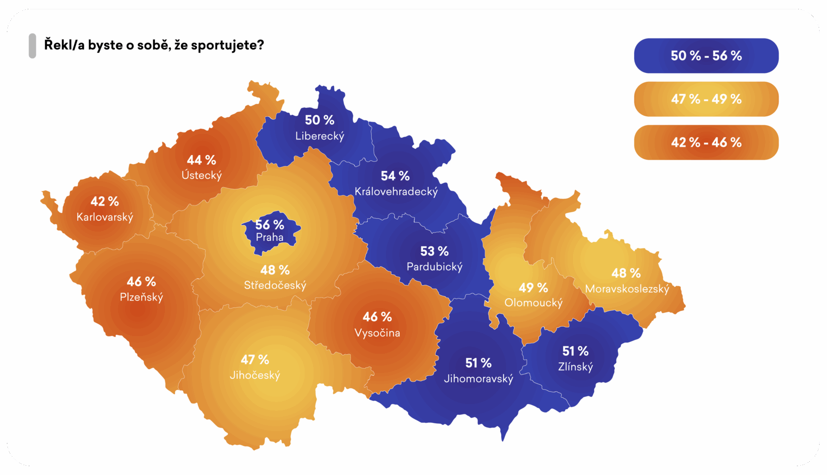 Vztah ke sportu se v krajích výrazně liší. Nejaktivnější je Praha, nejméně se sportuje na Karlovarsku, Ústecku a Plzeňsku